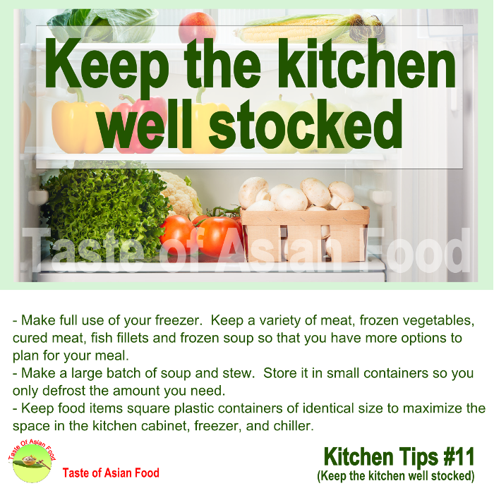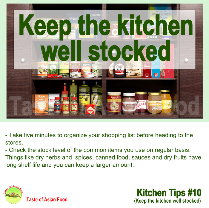 – Check the stock level of the common items you use on a regular basis. Things like dry herbs and spices, canned food, sauces and dry fruits have long shelf life and you can keep a larger amount.: Keep the kitchen well stocked