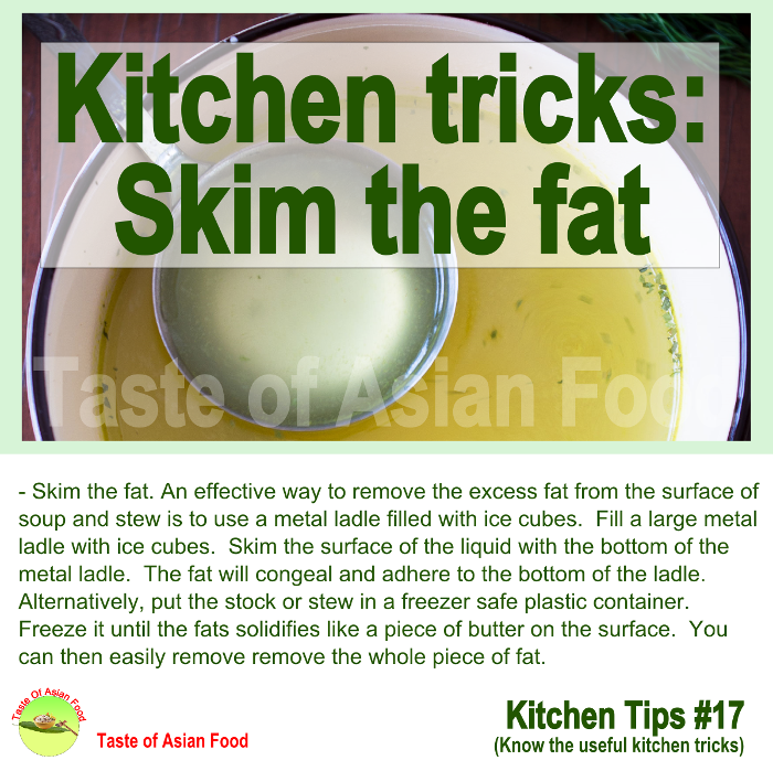 – Skim the fat. An effective way to remove the excess fat from the surface of the soup and stew is to use a metal ladle filled with ice cubes. Fill a large metal ladle with ice cubes. Skim the surface of the liquid with the bottom of the metal ladle. The fat will congeal and adhere to the bottom of the ladle. Alternatively, put the stock or stew in a freezer safe plastic container. Freeze it until the fats solidifies like a piece of butter on the surface. You can then easily remove the whole piece of fat.