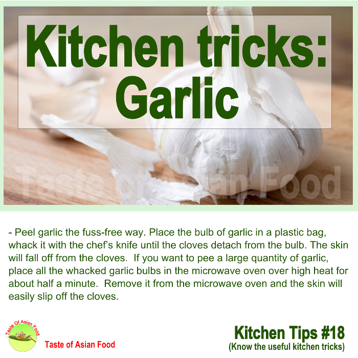 – Peel garlic the fuss-free way. Place the bulb of garlic in a plastic bag, whack it with the chef’s knife until the cloves detach from the bulb. The skin will fall off from the cloves. If you want to pee a large quantity of garlic, place all the whacked garlic bulbs in the microwave oven over high heat for about half a minute. Remove it from the microwave oven and the skin will easily slip off the cloves.