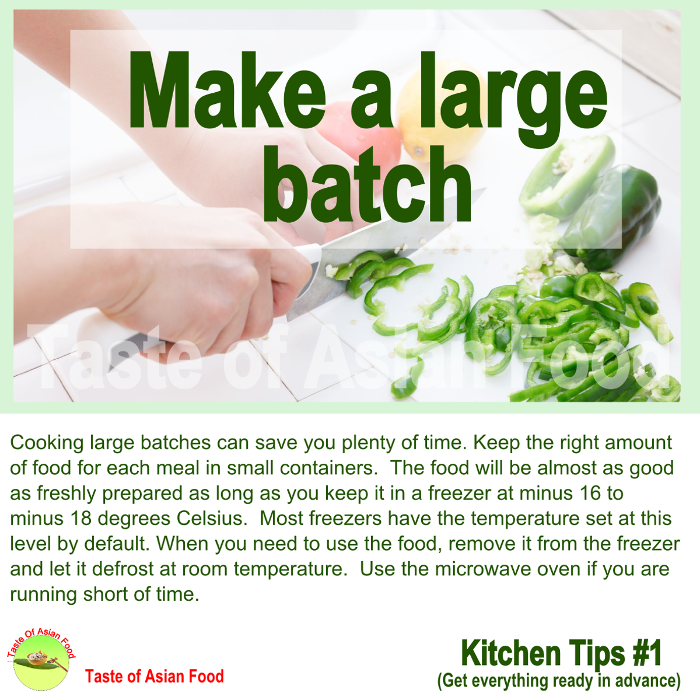 Cooking large batches can save you plenty of time. Keep the right amount of food for each meal in small containers. The food will be almost as good as freshly prepared as long as you keep it in a freezer at minus 16 to minus 18 degrees Celsius. Most freezers have the temperature set at this level by default. When you need to use the food, remove it from the freezer and let it defrost at room temperature. Use the microwave oven if you are running short of time.