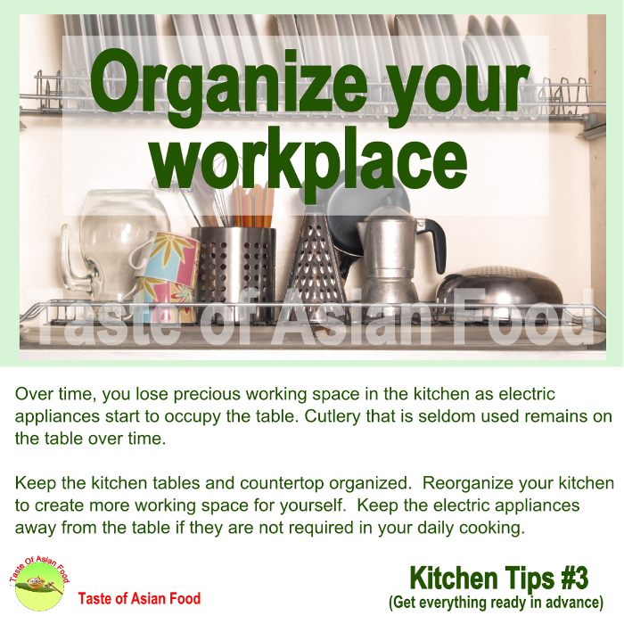 Keep the kitchen tables and countertop organized. Reorganize your kitchen to create more working space for yourself. Keep the electric appliances away from the table if they are not required in your daily cooking.
