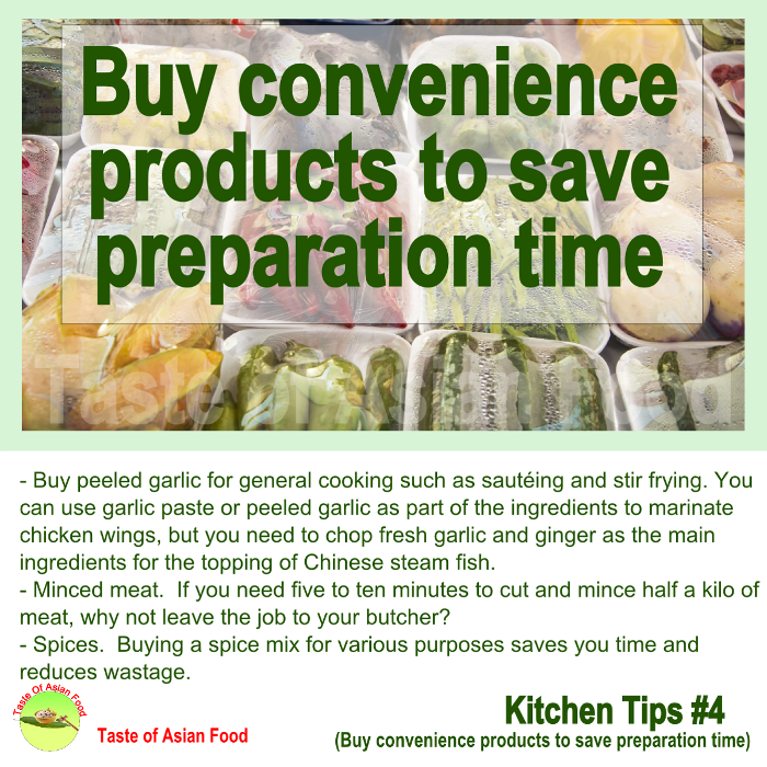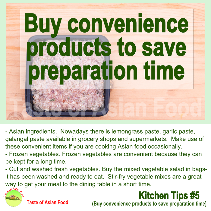 – Asian ingredients. Nowadays there is lemongrass paste, garlic paste, galangal paste available in grocery shops and supermarkets. Make use of these convenient items if you are cooking Asian food occasionally.