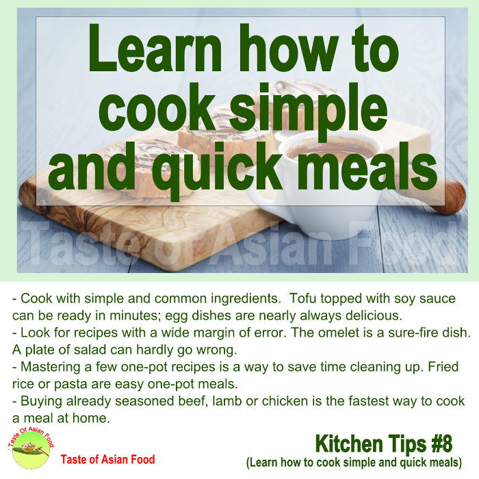 – Cook with simple and common ingredients. Tofu topped with soy sauce can be ready in minutes; egg dishes are nearly always delicious.