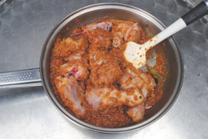 Add the curry paste to the coconut oil. You will notice the coconut oil will bubbling at the edge of the curry paste. When that happens, proceed to add the chicken.
