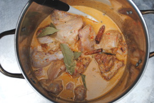 Now you can add the remaining coconut milk and braised the chicken. Add some water if there is not enough coconut milk to submerge the chicken fully for braising.
