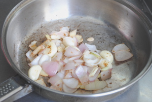 Cut a medium-sized onion into bite-size and add into the pot at this point. Some people would brown the onion first, which I find that the difference is not significant.