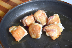 2. Once the ginger, garlic, and chili turn fragrant, add the chicken to the pan and pan-fried until slightly brown on both sides. It will take a few minutes. Be careful not to overheat the sesame oil, or it will acquire a bitter taste.