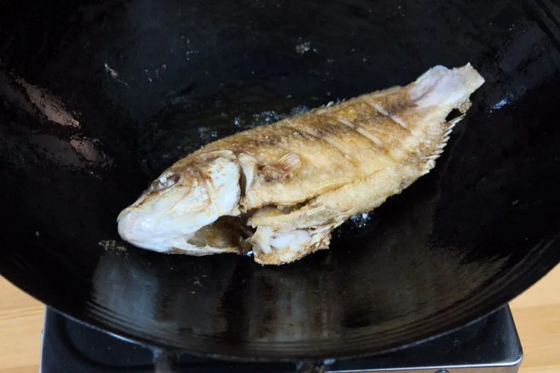 - Heat vegetable oil in a pan or wok over medium heat. Carefully place the fish into the oil. Pan-fry the fish until it turns golden brown on both sides. Avoid moving the fish during the first three minutes to prevent the skin from tearing. After pan-frying, remove the fish from the oil.