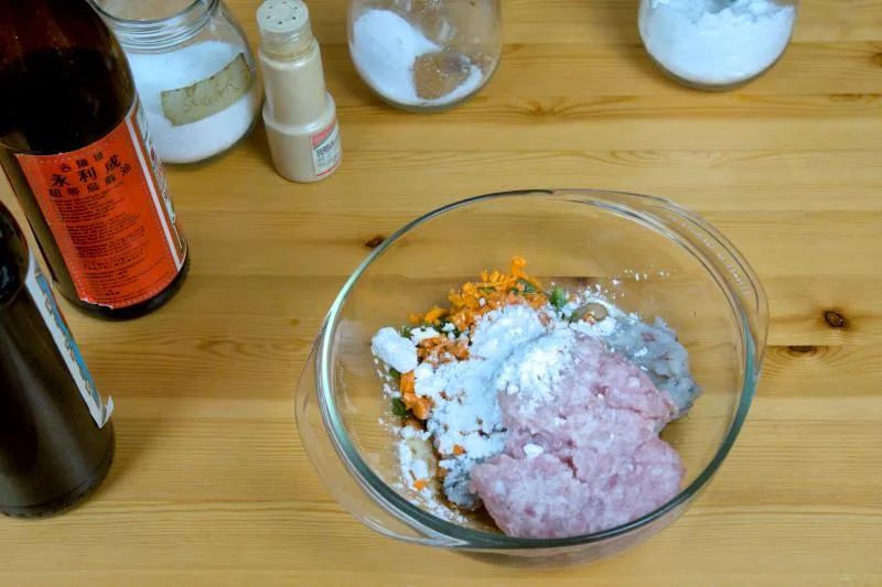 - Mix the shrimp paste and cubes with chopped green onion, diced carrot, and minced pork or fish paste. Then, season the mixture with Shaoxing wine, ground white pepper, sesame oil, sugar, salt, and cornstarch.