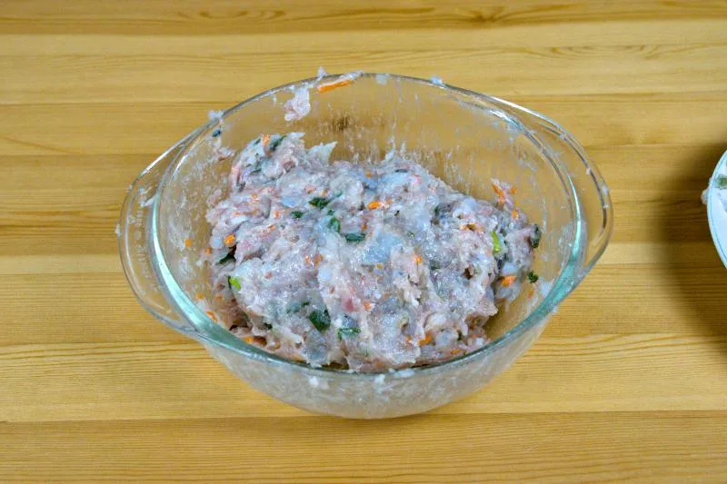 4. After mixing everything well by hand, wear a glove and lift the filling, then throw it back into the bowl repeatedly 20 to 30 times. This is a common Cantonese technique to mix the filling. The force from throwing helps break down the meat’s connective tissue, making the mixture more cohesive and paste-like. You’ll notice the ingredients will stick together much better after this. It also gives the filling a desirable springy texture.