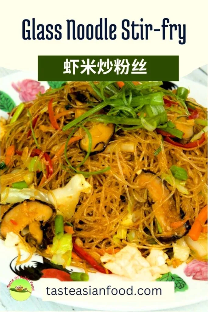 A step-by-step recipe for Glass noodle stir-fry with vegetables, mushrooms, and dried shrimp. Includes variations and cooking tips.