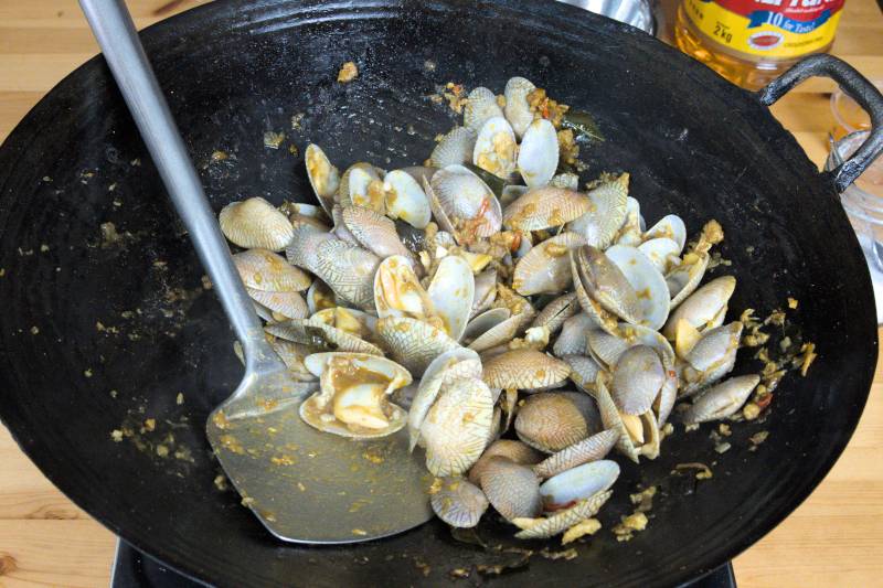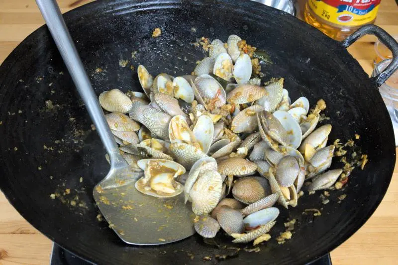 - Once the sauce comes to a boil, add the lala (a type of local clam) over medium heat. Stir-fry continuously to evenly mix the sauce with the clams.
