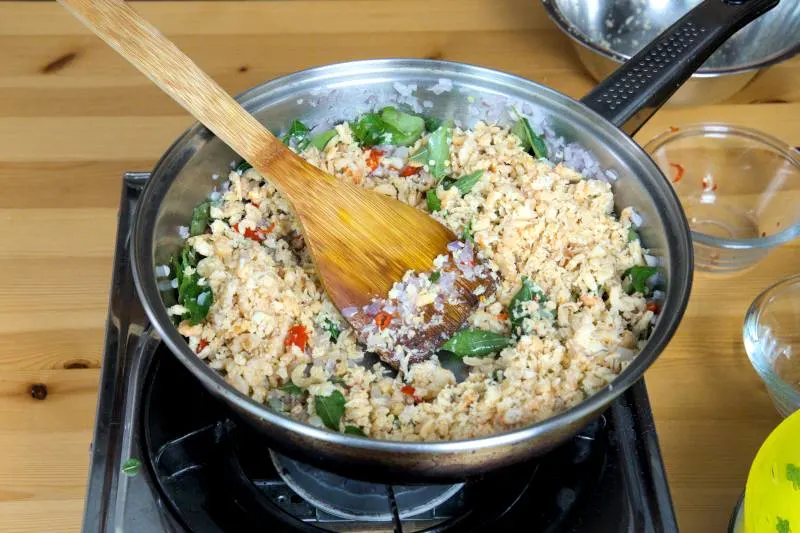- Heat some oil in a pan and sauté the onion, garlic, curry leaves, and chilies until aromatic. Then add the dried shrimp and continue sautéing until they become fragrant.