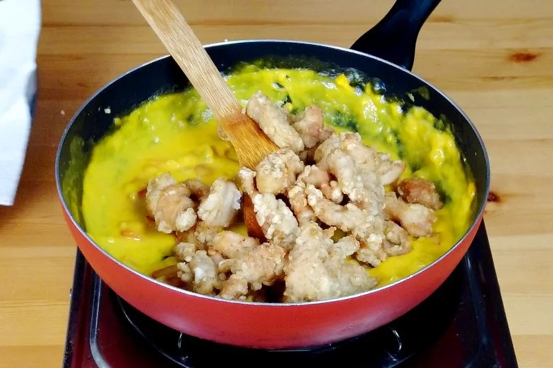 - Return the fried chicken to the wok to mix with the mango sauce.