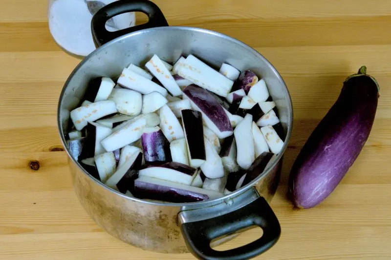 - Put the eggplant in the pot and fill it with just enough water to submerge them. Then, add a tablespoon of salt to the water and mix well. Let it sit for 15 minutes.