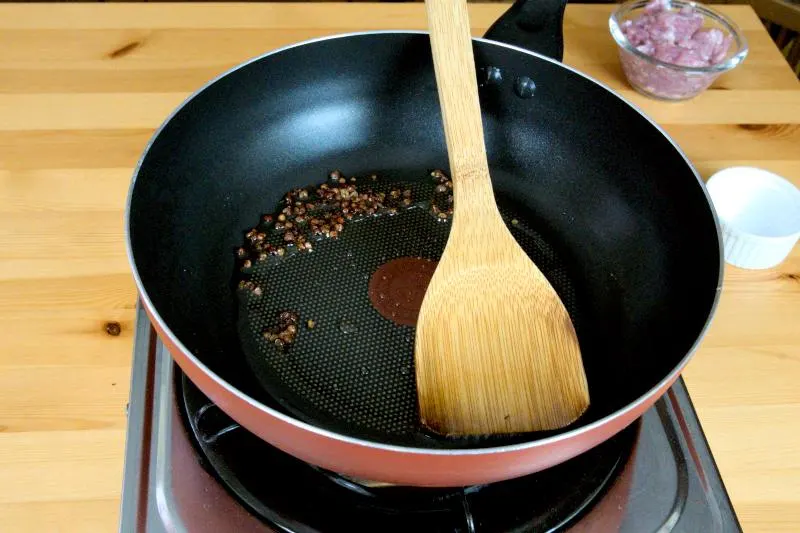 1. Heat the vegetable oil in a pan and add one teaspoon of Sichuan peppercorns. Temper the red Sichuan peppercorn over low heat for about one minute until the flavors develop. Then, let the oil pass through a fine-mesh strainer to remove the peppercorns.