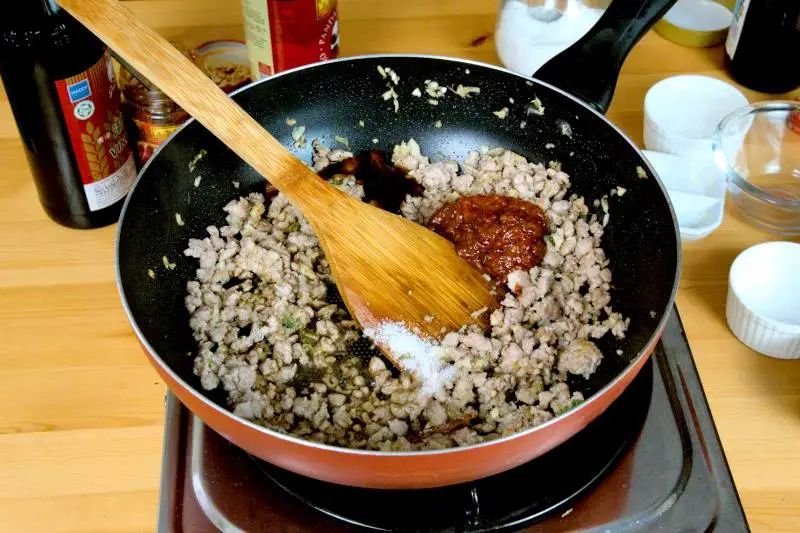 - Add the ground pork to the large pan and mix well with the aromatics. Stir and fry the pork for about 5 minutes until it is fully cooked and starts to dry out. Turn to medium-high heat to further fry the pork and develop bold flavors as it turns slightly brown.