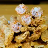 - Heat enough oil in a deep skillet to around 150°C (300°F), and fry the shrimp in small batches. Each batch should fry for about one minute or until the shells turn pink. Set the shrimp aside to cool for a few minutes. Then deep-fry them over high heat at around 190°C (375°F) for 30 seconds until crispy.