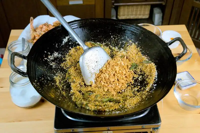 - Season with curry powder (if using) and a small pinch of salt and sugar. Add the fried shrimp back into the wok, turn up the heat, and toss everything together to let the garlic and bread crumbs coat the shrimp thoroughly.