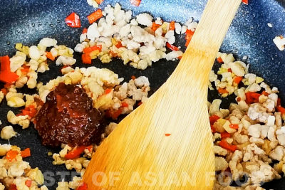 - Add the chili bean paste and stir-fry until it becomes aromatic. Then, add light soy sauce, dark soy sauce, sugar, and salt to season the mixture.