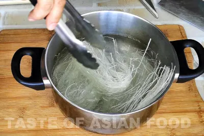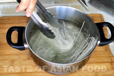 - Soak the glass noodles in cold water in a large bowl for 30 minutes, or until they are fully softened and rehydrated. This step is important because if not, the noodles will be too hard after stir-frying, especially if using the method without adding more water.