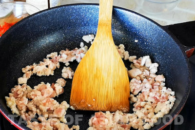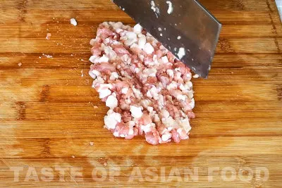 - Mince the ground pork finely.