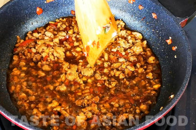 - Next, add some vegetable oil to a nonstick pan or a well-seasoned cast-iron wok and dry-fry the minced pork. There’s no need to season it at this stage, as we will add the seasonings later. I prefer to stir-fry it over low to medium heat until the pork becomes dry, slightly crispy, and lightly charred on the surface, which will take 5-6 minutes. This method helps bring out the best flavor.