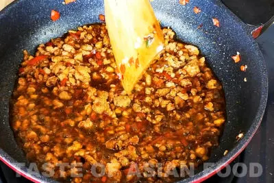 - Fry the minced pork with oil over low to medium heat until the pork becomes dry, slightly crispy, and lightly charred on the surface, which will take 5-6 minutes. Add the chopped ginger and garlic to the pan halfway way stir-frying the pork.