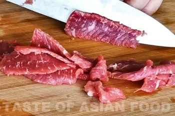 I prefer to cut the beef into five cm wide strips, then slice across the grain. Any smaller size does not look good because the slices of beef will shrink after stir-frying.