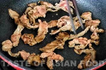Pan-fried the beef slices with some cooking oil. You can reduce the amount of oil required by using a non-stick pan. Stir-frying the beef with a wok will need more oil.