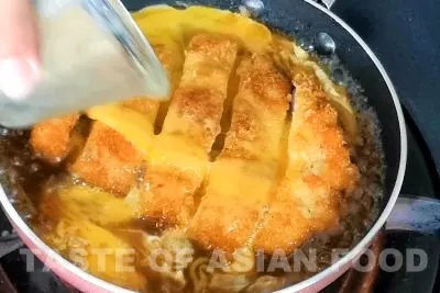 The torikatsu can be served off the stove immediately. However, we cook it once more with a combination of dashi and egg. If you have leftover torikatsu, skip the previous steps, and move into this section right away.