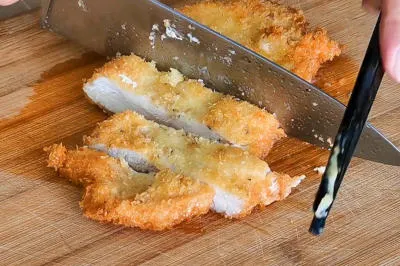 Deep-fry the chicken breast for four minutes on each side or until it turns golden. Try only flip the chicken breast over once to minimize the breadcrumbs from falling off into the oil.