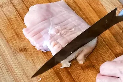 Cut the chicken breast to a thickness of about 1.5cm (0.6-inch slices). This thickness is ideal because if the meat is too thick, the center may not cook when the surface has turned to golden color. If it is too thin, the meat will become dry and tough.