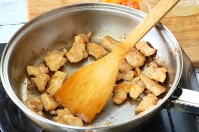 7. Pan-fry the chicken meat until slightly brown. brown the chicken