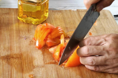 • Cut a tomato into slices. Set aside.