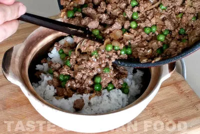 - Place the steamed rice in a clay pot. Scoop the ground beef onto the rice. Cover and simmer over low heat for about five minutes.