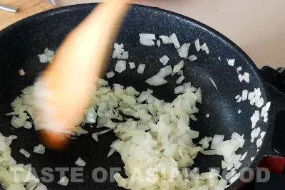 - Saute the onion in a pan or a large skillet with oil until it is soft and slightly caramelized. Add the coarsely chopped garlic halfway through sautéing the onion.