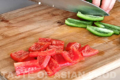 I also include red and green bell pepper, but cucumber and carrots are other popular choices. I cut my bell pepper into the size about the same as the tofu. If you intend to use carrot, cut it into thin slices or small cubes to cook through quickly.