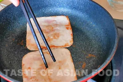 - Pan-fried two slices of ham of your choice (or use luncheon meat), then cut into slices or strips