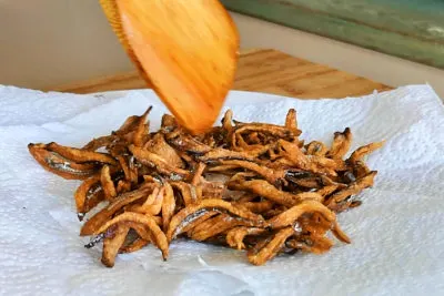 • It takes about one minute to crisp up the anchovies. The exact duration depends on the temperature of the oil and the dryness of the anchovies. You can remove the anchovies when the oil stops sizzling and bubbling.