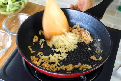 5. Saute the chopped garlic, followed by the dried shrimp. Season with some salt.Sauteed green bean - sauteed garlic and dried shrimp