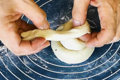 7. Roll up the dough like making a Swiss roll. Roll and stretch the dough to form a long rope.
