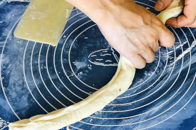 1. Starting from the long edge, roll the dough tightly into a log, like a Swiss roll.
