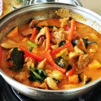 Thai red chicken curry is the best Thai curry, season with kaffir lime and fish sauce to get the authentic flavor. The curry paste is made from scratch.